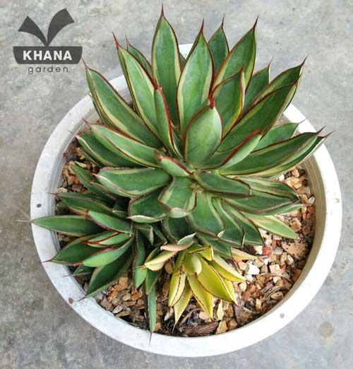 อกาเว่ต้นนี้เราซื้อมาเลี้ยงประมาณปีกว่าแล้ว ก็ปลูกเลี้ยงตามสไตล์สวนคณา คือแดดร้อยฝนร้อย ก็ตั้งไว้เลย ฝนไม่ตกก็ไม่ค่อยจะได้รดน้ำเท่าไหร่หรอก ก็ทน ๆ กันไป อกาเว่เขาว่าทนแดดทนฝน ก็ลองเลี้ยงตามที่เขาว่าดูหน่อย