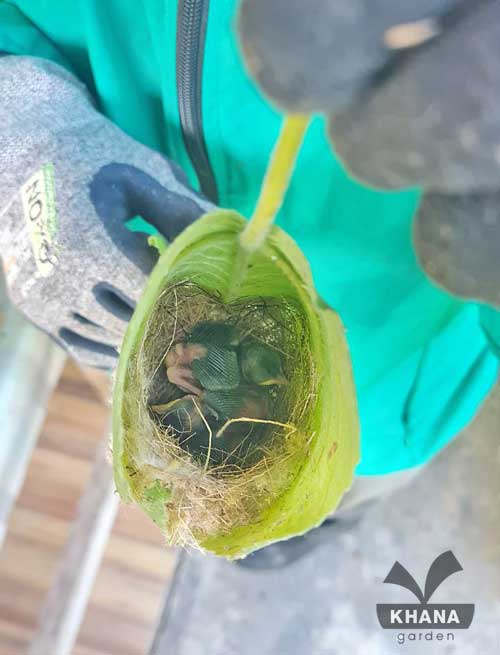วันก่อนถากถางพื้นที่ใกล้บ้าน ก็ได้ยินเสียงนกอยู่ แต่เข้าใจว่ามันอยู่อีกตำแหน่ง คิดไปว่ามันอยู่แถวต้นไม้ใกล้ ๆ รื้อไปรื้อมาเจอรังนกอยู่ในใบของต้นปอกระสาที่สูงแค่เมตรกว่า ๆ แล้วก็ไม่ถึงขนาดรกทึบอะไรนัก แต่นกก็ยังสามารถไปสร้างรังด้วยใบไม้ได้