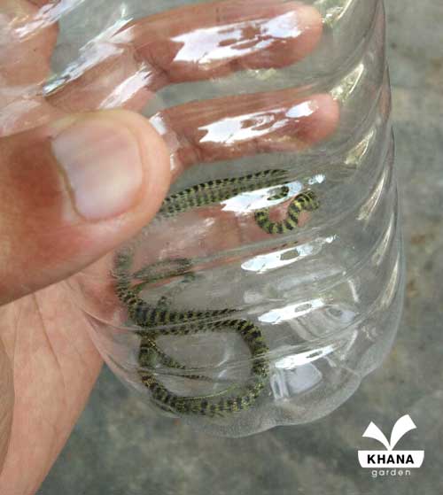เนื่องจากอยู่บ้านสวน ก็เลยต้องหาความรู้เกี่ยวกับการรับมือเมื่อพบงูไว้บ้าง เพราะถ้าเจอจริง ๆ จะได้รู้ว่าควรทำอะไร ไม่ควรทำอะไร งูชนิดไหนมีพิษไม่มีพิษ จำเป็นต้องเรียนรู้ไว้ และด้วยความรู้ที่ได้ร่ำเรียนมา จึงทำให้เราจับงูในวันนี้ได้สำเร็จ ขวดน้ำพลาสติก เป็นเครื่องมือที่ดีสำหรับจับงูขนาดเล็ก ปลอดภัยทั้งงูทั้งเรา ไม่ต้องไปตีมัน จับได้แล้วก็ไปปล่อยในสวนไกล ๆ เหมือนเดิม เดี๋ยวมันโตกว่านี้มันก็เข้ามาไม่ได้แล้วล่ะ อ้อ ถ้าอุดร่องประตูด้วยยาง มันก็เข้าไม่ได้เหมือนกัน