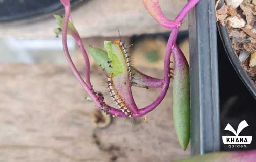 หนอนพวกนี้ น่าจะเห็นหนอนผีเสื้อ มาเป็นช่วง ๆ ไม่ได้มีตลอดปี ช่วงไหนบุกมา เก็บออกไปที่อื่น ก็แก้ปัญหาได้แล้ว เว้นเสียแต่ว่าจะเห็นอีกที ต้นไม้ก็กุดไปหมดแล้ว แบบนี้ก็ทำใจ คล้าย ๆ กับบอนสี หนอนจะหลบอยู่ใต้ใบ ต้องดูรอยแทะเอา ถ้าเผลอทิ้งไว้ มันก็กินหมดต้นก็เจอบ่อย ๆ แต่กับพวกไม้อวบน้ำนี่กินจนกุดก็เห็นไม่บ่อย ก็แล้วแต่ชนิดด้วยว่าหนอนที่มาบุกนี่ตัวใหญ่ไหม ถ้าตัวใหญ่กินจุ มันก็กินหมดได้เหมือนกัน ก็ต้องหมั่นดูแลกันไป