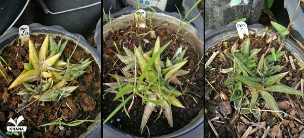 สำหรับส่วนผสมดินที่ใช้ ก็ใช้เป็นดินปลูกสูตรทั่วไปของสวนคณา คือมีส่วนผสมของดินก้ามปูแบบถุง แกลบดิบ กาบมะพร้าวสับ ใส่ลงไปในกระถางให้เต็ม และนำลิ้นมังกรมูสที่เป็นหน่อจากต้นแม่ปลูกลงไป และวางทิ้งไว้ในพื้นที่โล่งแจ้ง โดนแดดทั้งวัน ไม่มีการพรางแสงใด ๆ รับน้ำฝน 100%