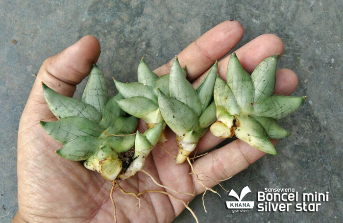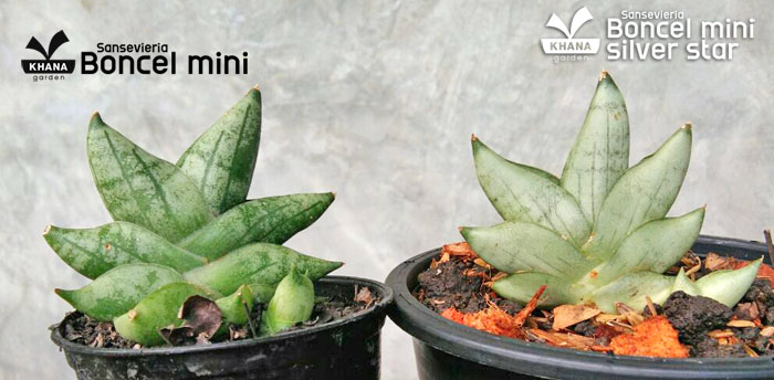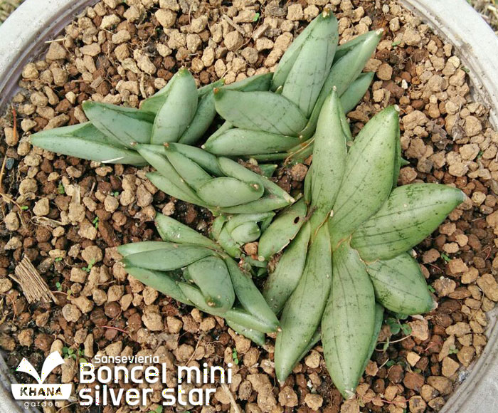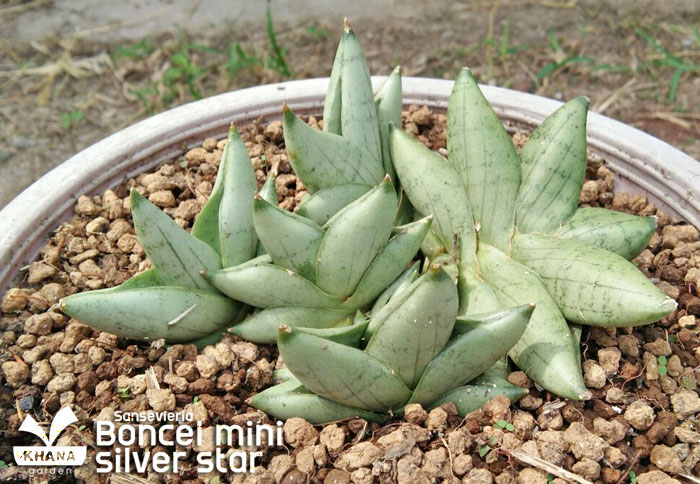 Sansevieria boncel mini silver star ลิ้นมังกรขนาดเล็ก คล้ายบอนเซลมินิ มีสีโทนขาว ใบสั้นกลม มีลายเล็กน้อย ใช้พื้นที่ในการปลูกน้อย ทนแล้งได้ดี เลี้ยงง่าย ไม่ต้องดูแลมาก ไม่เหมาะกับการวางในที่ที่โดนแสงแดดจัด เมื่อเติบโตเต็มที่จะแตกหน่อเป็นกอดังรูป