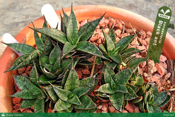 Sansevieria black ant ลิ้นมังกรแบล็คแอนท์ ‘มดดำ‘ ต้นเล็ก สีเข้ม ใบแบน โตได้ไม่เท่าไหร่ก็แตกหน่อ สามารถเลี้ยงไว้เป็นไม้ทรงพุ่มแคระได้ เลี้ยงง่าย ที่สวนเราก็วางลืม ๆ ไว้ นาน ๆ ทีก็ไปถอนวัชพืชบ้าง ก็โตดีขยายครอบครัวกันอย่างที่เห็น จากประสบการณ์ของเราลิ้นมังกรแบล็คแอนท์เหมาะกับการเลี้ยงในร่มรำไร หรือได้รับแดดครึ่งวันมากกว่าแดดเต็มวัน