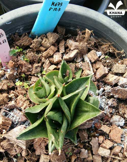 สำหรับลิ้นมังกรในอุดมคติของสวนคณาก็คือไม้ที่ทนแดดจัดได้ มีสีเขียวสด และมีขนาดเล็ก แน่นอนว่าเราก็พยายามที่จะพัฒนาพันธุ์โดยการผสมเกสรแล้วคัดพันธุ์ แต่วิธีนี้มันก็ต้องใช้เวลาค่อนข้างนาน สำหรับในกรณีของ K675 จะเป็นไม้เมล็ดที่รับมาเลี้ยงต่อจาก breeder ท่านอื่น หมายถึงเป็นลูกไม้เมล็ดลิ้นมังกรที่คนอื่นเขาผสมเกสร เก็บเมล็ด แล้วเพาะพันธุ์ขึ้นมา (รหัสไม้ที่ขึ้นต้นด้วย K จะเป็นไม้เมล็ดที่รับเลี้ยงมา ส่วนรหัสที่ขึ้นต้นด้วย s จะเป็นลูกไม้ลิ้นมังกรที่สวนคณาพัฒนาพันธุ์ขึ้นมาเอง)