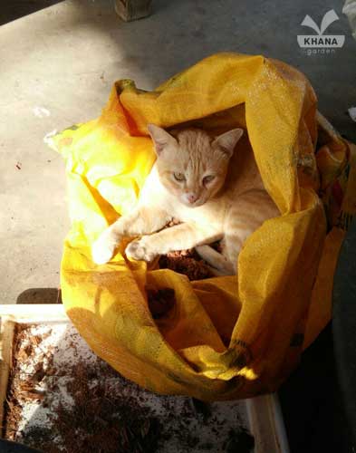 อย่างในภาพนี้เราก็ปลูกต้นไม้อยู่ แมวก็จะเข้ามาวุ่นวายตามมุมนั้นมุมนี้ สุดท้ายก็ได้มุมที่เหมาะ มานอนขวางกระสอบกาบมะพร้าวสับเสียเลย ด้วยความที่งานเราใกล้จะเสร็จแล้ว เราเลยปล่อยมันนอนไปอย่างนั้น ก่อนจะไปก็ถ่ายรูปไว้เสียหน่อย ว่าเจ้าตัวนี้มันวุ่นวาย จนเราเรียกชื่อมันว่า “วุ่นวาย” ส่วนอีกชื่อคือ สุดหล่อ เพราะมันดูหล่อจริง ๆ เวลามันนิ่ง ๆ