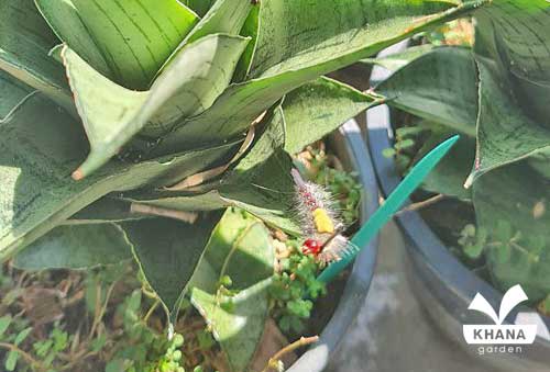 ปกติแล้วจะไม่ค่อยเห็นหนอนมากินใบลิ้นมังกรสักเท่าไหร่ เพราะใบลิ้นมังกรส่วนใหญ่พอแก่ไปจะเหนียว เส้นใยเยอะ แต่ถ้าพวกใบอ่อน ๆ ก็เห็นว่าโดนกินบ้างเหมือนกัน วิธีแก้คือหมั่นดูแล เจอก็จับออกไปไกล ๆ มันไม่ขยันเดินกลับมาหรอก ส่วนใหญ่ที่โดนกินไปเยอะ เพราะไม่ค่อยได้ดูแล อยู่ไกลสายตา